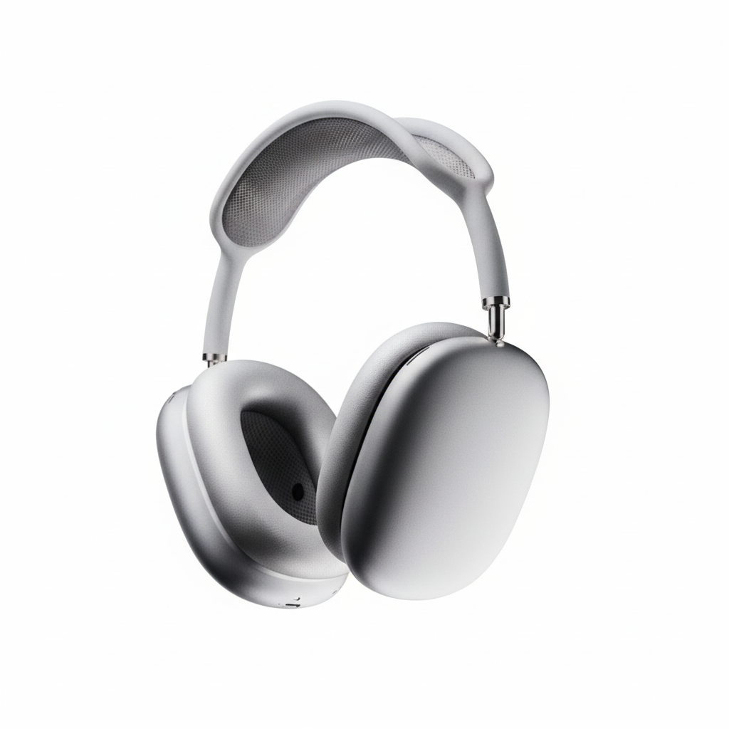 シルバーとホワイトのスリムでプレミアムなオーバーイアヘッドホン:最小限のロゴと未来的で軽量なデザイン美学