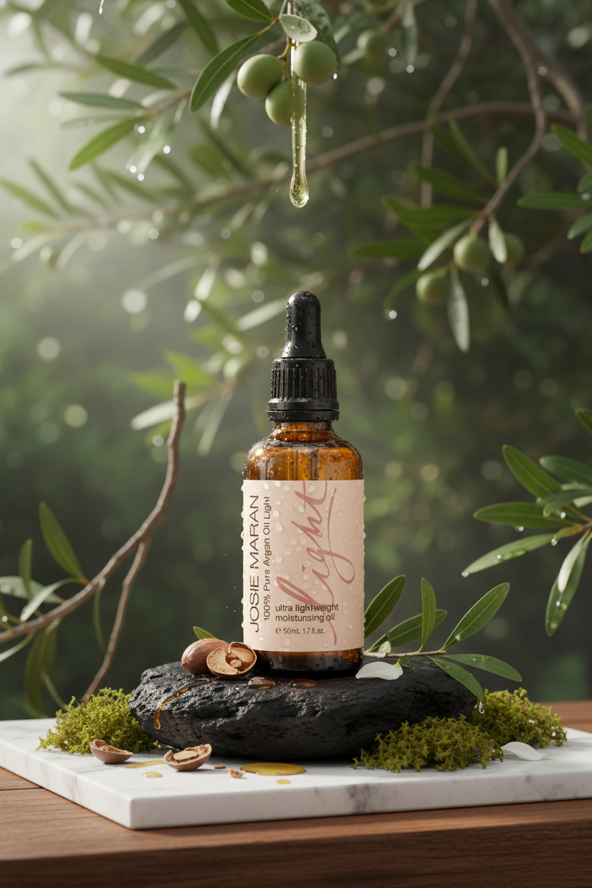高級スキンケアブランド向け:オリーブの木立の中で輝くアルガンオイルライト – 純粋さ・自然・柔らかな光を強調