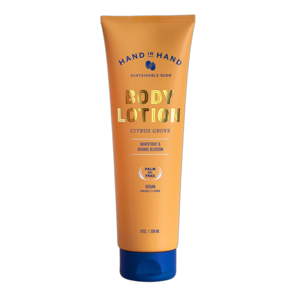 ゴールド箔文字とネイビーのブランドアクセントが特徴のオレンジチューブ入りプレミアム柑橘系ボディローション