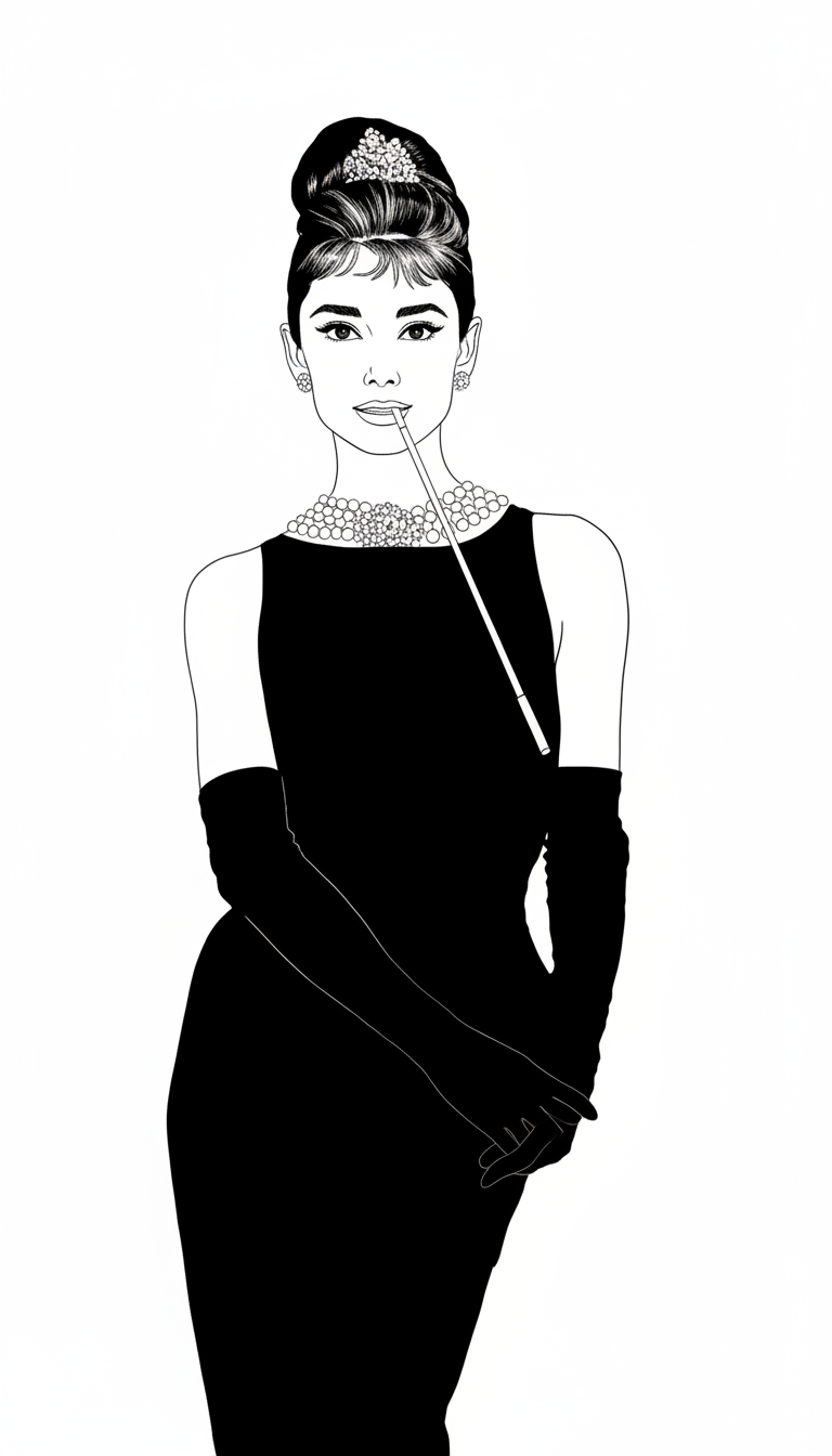 パール・ティアラ・シガレットホルダーを合わせたタイムレスな黒ドレスシルエット:ヴィンテージハリウッドのグラマーと洗練された優雅さを演出