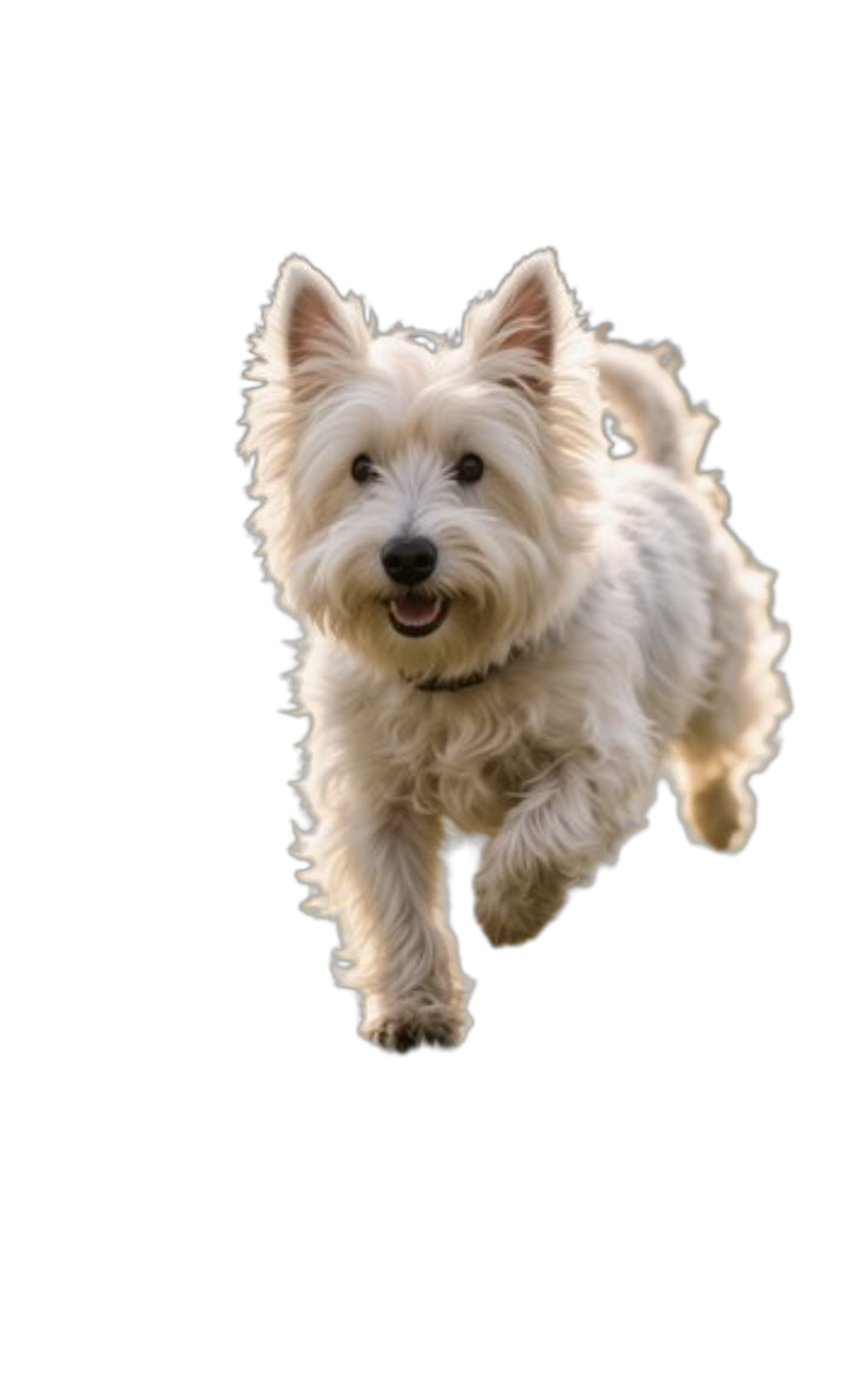 黒バックスタジオで、カメラに向かって元気よく走ってくるふわふわの白いテリア