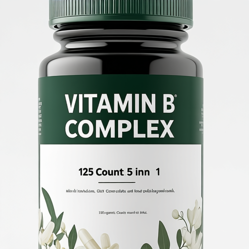 植物モチーフをあしらったグリーンラベルのミニマルビタミンボトル:大胆な「Vitamin B Complex」タイポグラフィが特徴