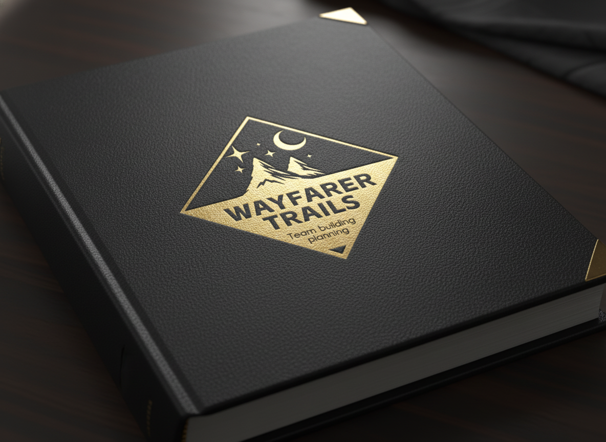 三日月の下の山々を描いた豪華な金箔エンブレム:黒革カバーに浮き彫りされ、チームビルディングの冒険を象徴