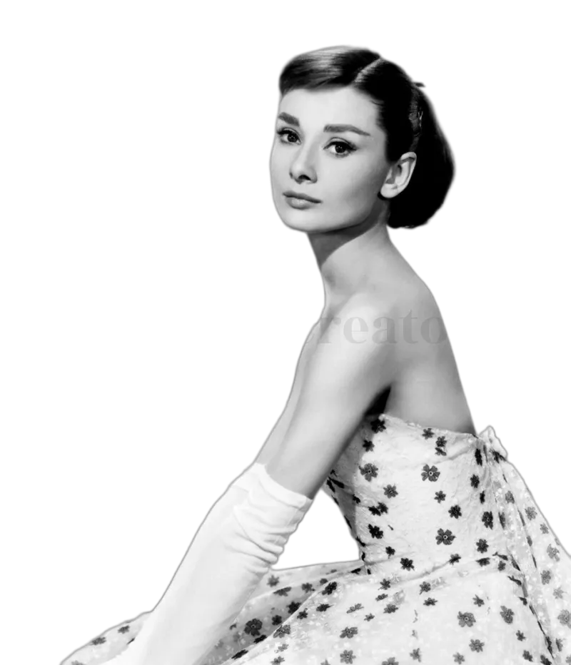 Elegant Vintage Noir: a timeless B&W portrait of a poised woman in a floral strapless gown with elbow-length gloves.