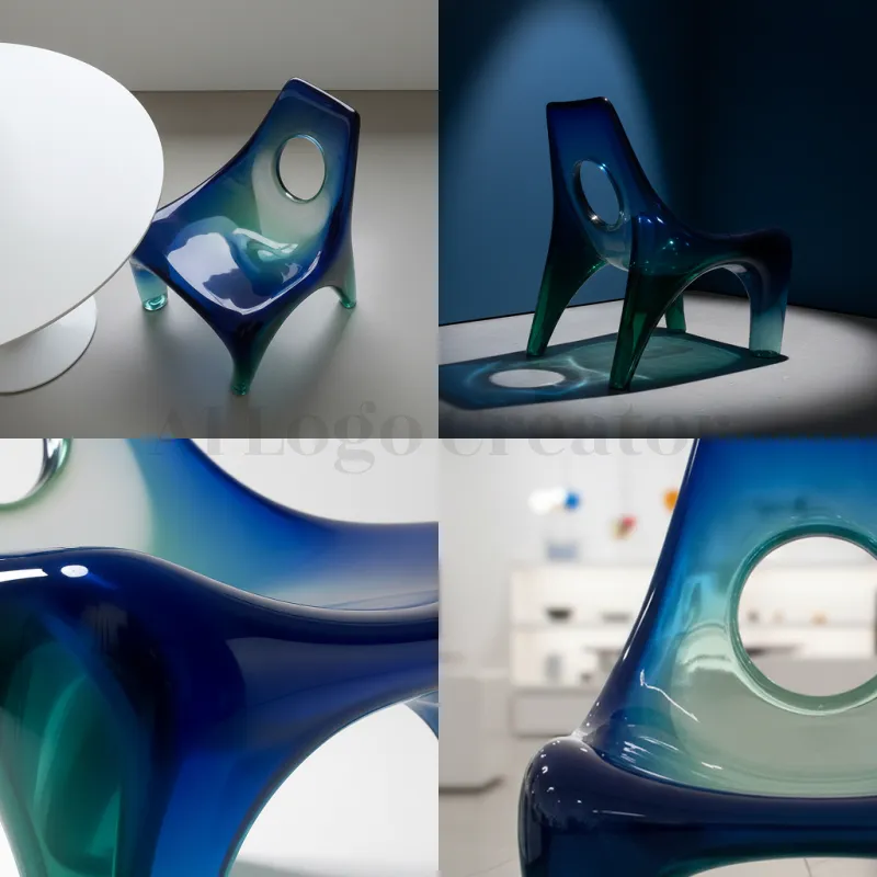 A translucent gradient chair sculpture in blue-green hues showcased in a minimalist studio with circular cutout.