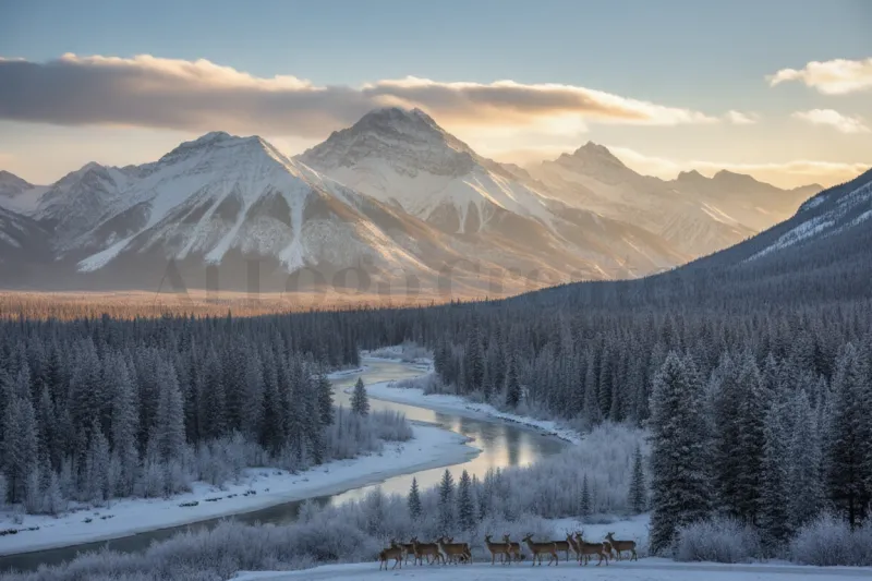 A tranquil alpine winter scene with a deer herd along a winding river beneath snow-capped mountains.
